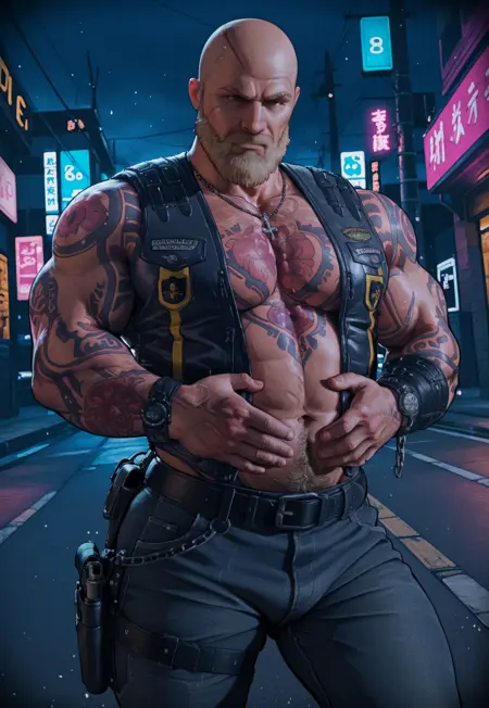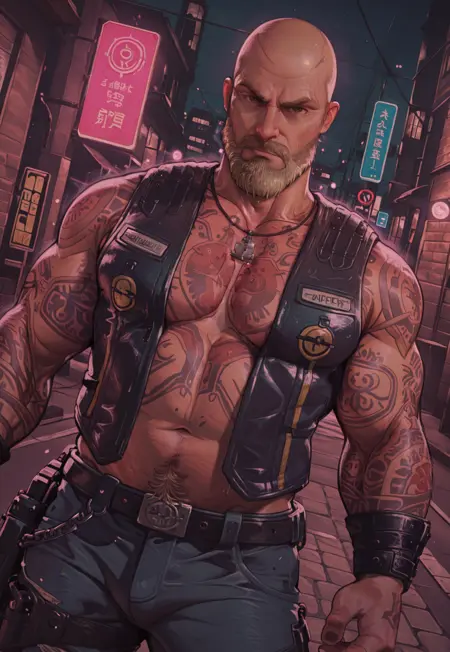 通用特征:棕色眼睛、长长的金色胡须、面部毛发、纹身、秃头、项链、疤痕、愤怒表情、胸部纹身