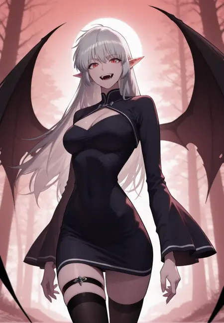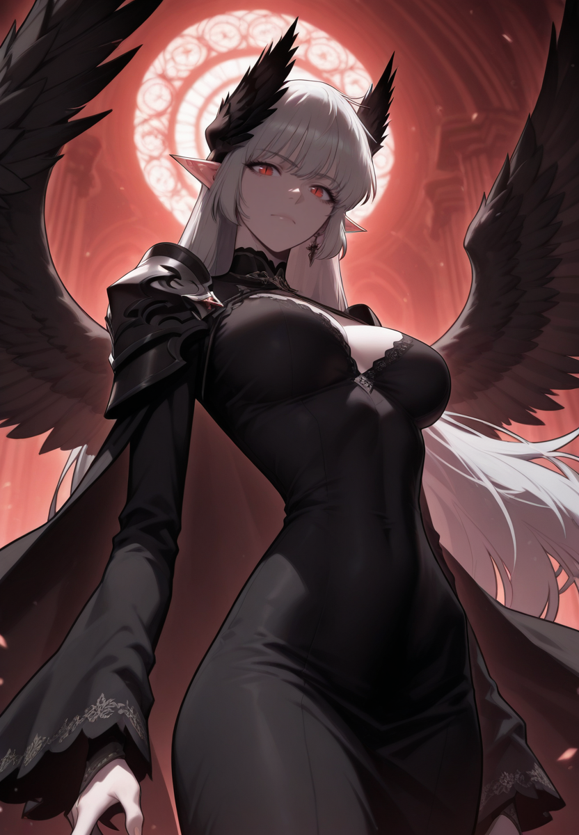 /aliceadultcombat/, 1girl, red eyes, grey hair, long hair, pointy ears, head wings,