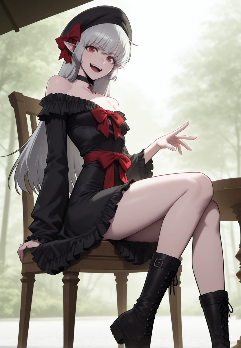 beret, choker, red bow, frilled black dress, belt, off-shoulder dress, boots