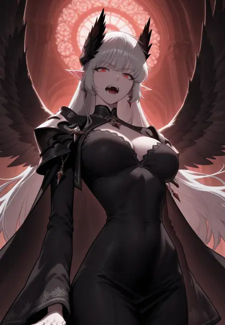 fangs, slit pupils, sharp fingernails, feathered wings, bangs