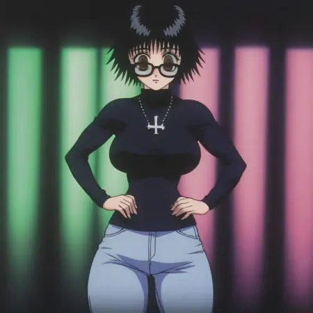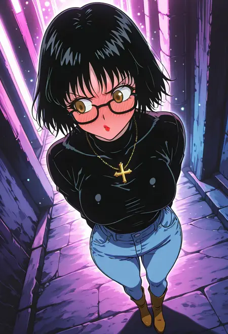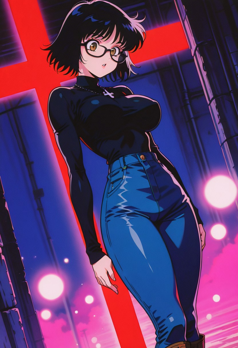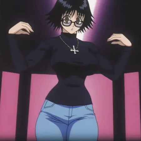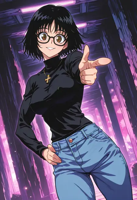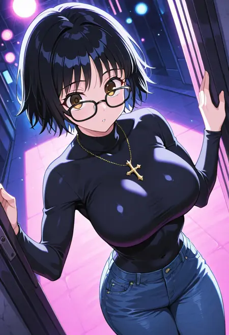 ShizukuMurasakiHxH, 1个女孩, 单人, 黑发, 短发, 刘海, 棕色眼睛, 黑框眼镜, 厚唇, 黑色高领毛衣, 带倒十字架的项链, 大胸, 纤细腰肢, 厚大腿, 沙漏身材, 蓝色牛仔裤, 棕色靴子,