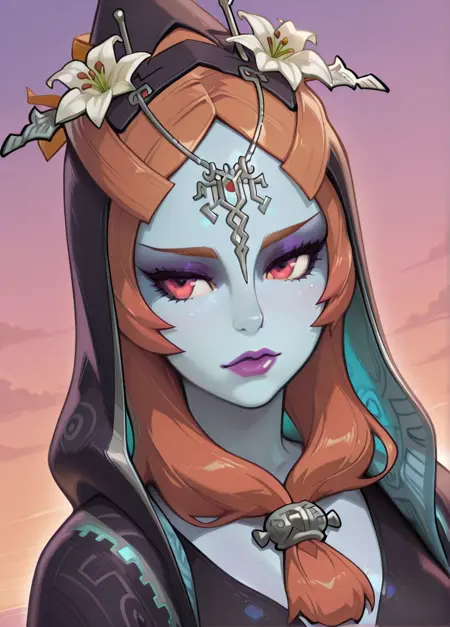 midnaxd, 1girl, solo, yellow sclera, front ponytail, colored skin, orange hair, colored sclera, purple lips, blue skin,, red eyes, long hair, tatoo