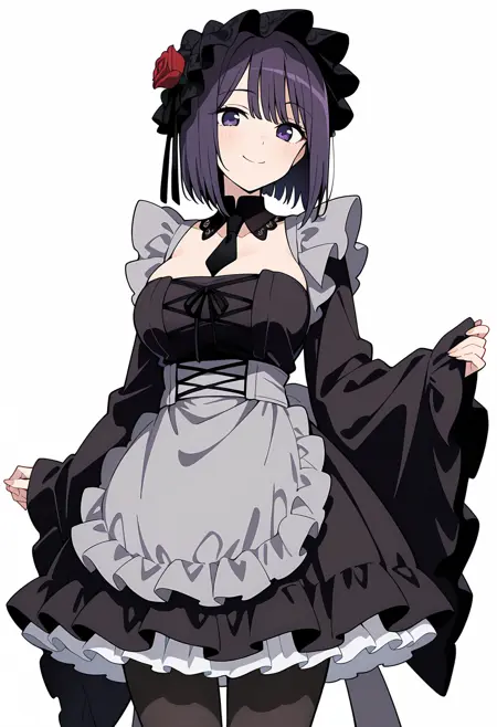 marin-shizuku, alternate hair color, purple hair, short hair, alternate eye color, purple eyes, black bonnet, red rose, black dress, black frilled dress, frills, detached collar, black necktie, necktie between breasts, frilled grey apron, grey waist apron, petticoat, pantyhose, lace trim, wide sleeves, long sleeves, sleeves past wrists,