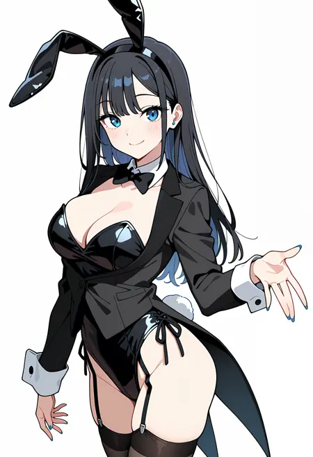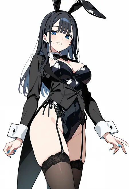 black rabbit ears, black headband, fake animal ears, playboy bunny, black bowtie, detached collar, black jacket, tailcoat, long sleeves, white wrist cuffs, blue nails,