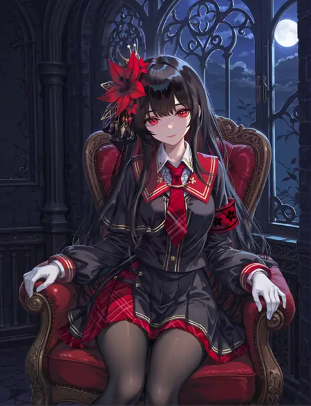 appearance: hair ornament, long sleeves, red eyes, black hair, long hair, hair flower, shirt, skirt, single gloves, white gloves, necktie, black pantyhose