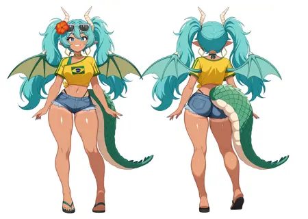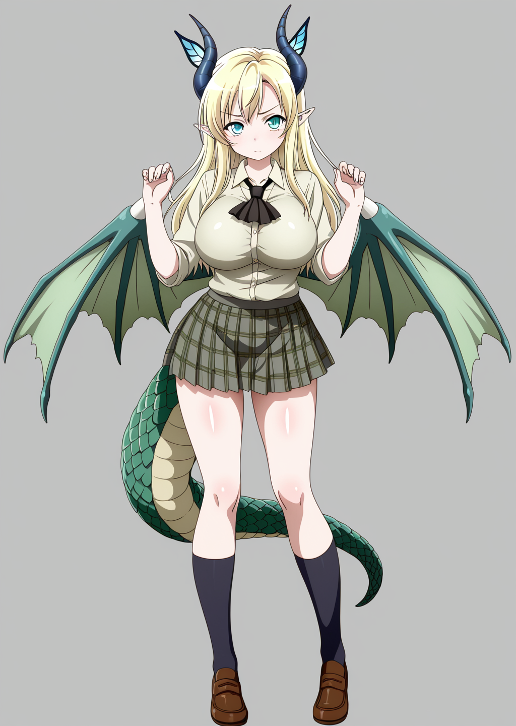 프롬프트: 드래곤 소녀, 드래곤 꼬리, 뾰족한 귀, 드래곤 뿔, 드래곤 날개, 몬스터 소녀,