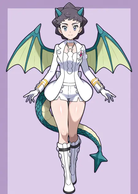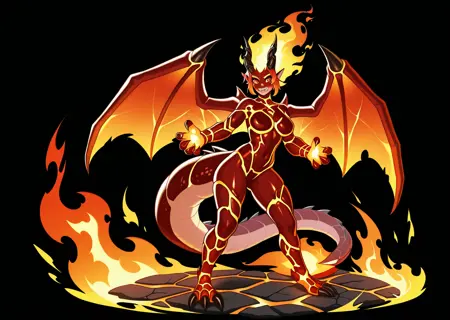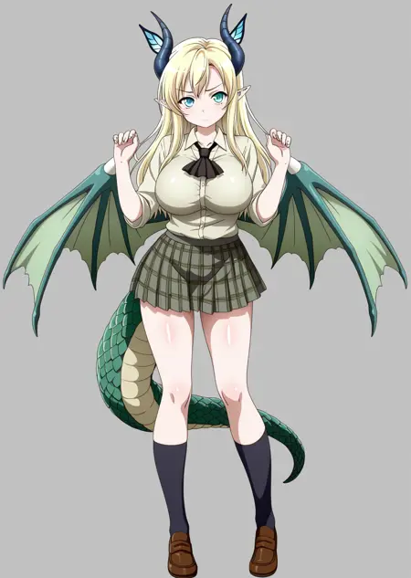 プロンプト: ドラゴンガール、ドラゴンの尾、尖った耳、ドラゴンの角、ドラゴンの翼、モンスターガール