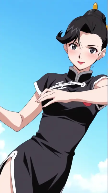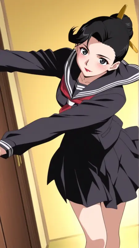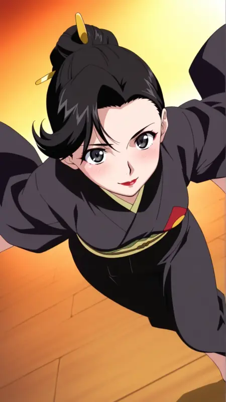 외모: 검은 머리, 머리 뾰족, 검은 눈, 머리 장식, 머리 장식, 립스틱, 메이크업,