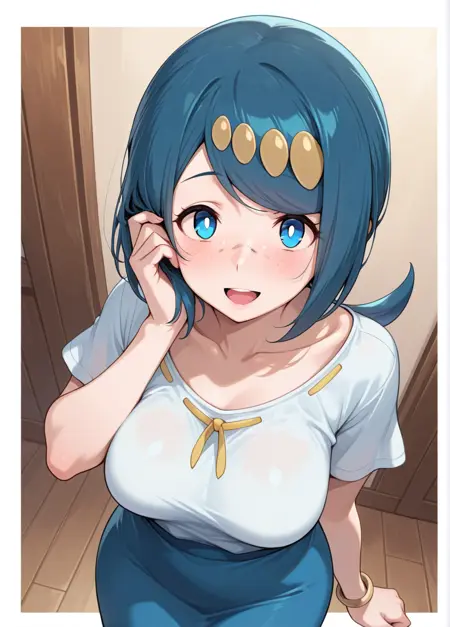 lanamom, 1girl, solo, blue hair, blue eyes, mature female, freckles, long hair, hair ornament, bright pupils