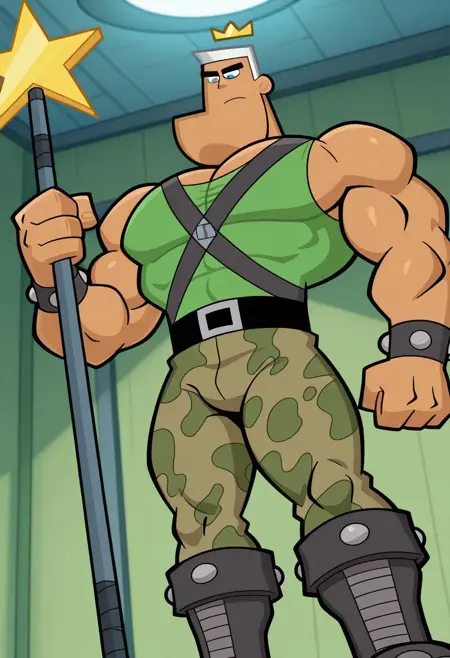 Outfit Prompts: "floating crown, green tank top, chest harness, camouflage pants, boots, spiked bracelet"