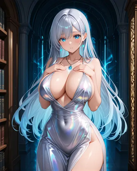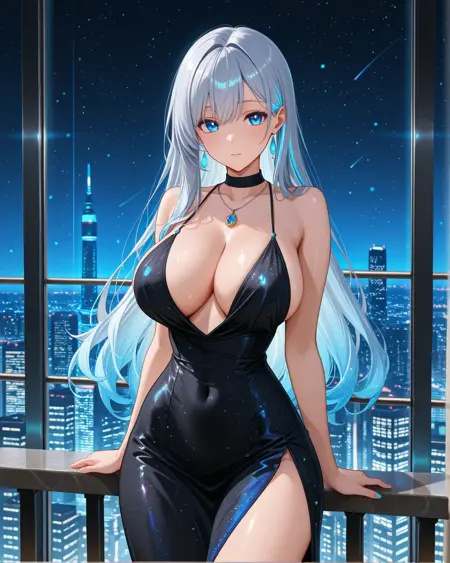 (silver long hair with steel blue highlights, silver hair, long hair), smooth silky hair, blue eyes,