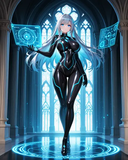 黑色高科技合成服,带有霓虹蓝发光线条,未来主义设计,贴身剪裁,优雅轮廓,微妙的发光电路,高领,长袖,流线型设计,赛博朋克风格美学,搭配同色系靴子,发光点缀,精致未来感优雅