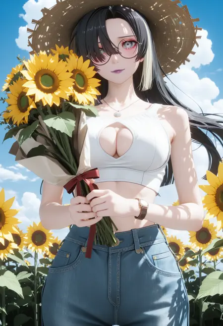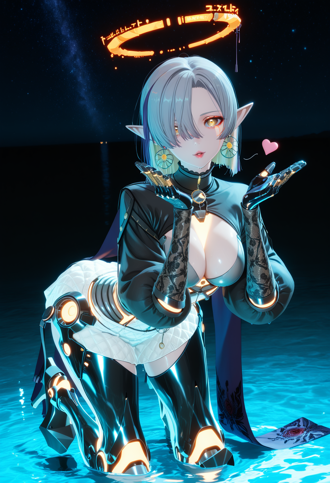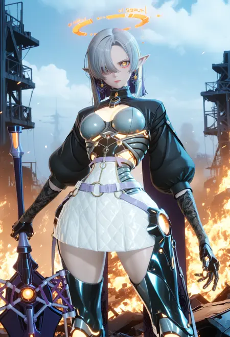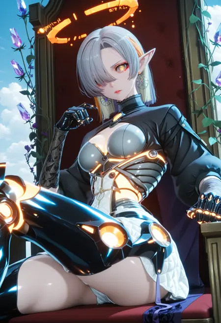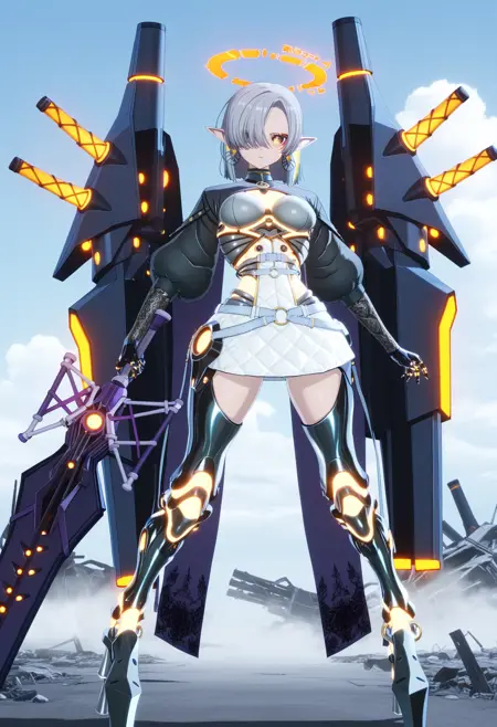 노랑색 기계적 할로, 보석 환형 귀걸이, 기계적 척추, 검은 풍성한 소매, 검은 쉬르그(옷), 진보라색 분할 망토, 노랑색 네온 테두리, 흰색 미니스커트, 꽃무늬 프린트 장갑, 검은 기계식 손, 회색 벨트, 벨트 버클, 검은 기계식 다리, 빛나는 로봇 관절, 기계 부품, 플랫폼 힐,