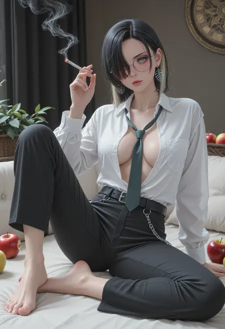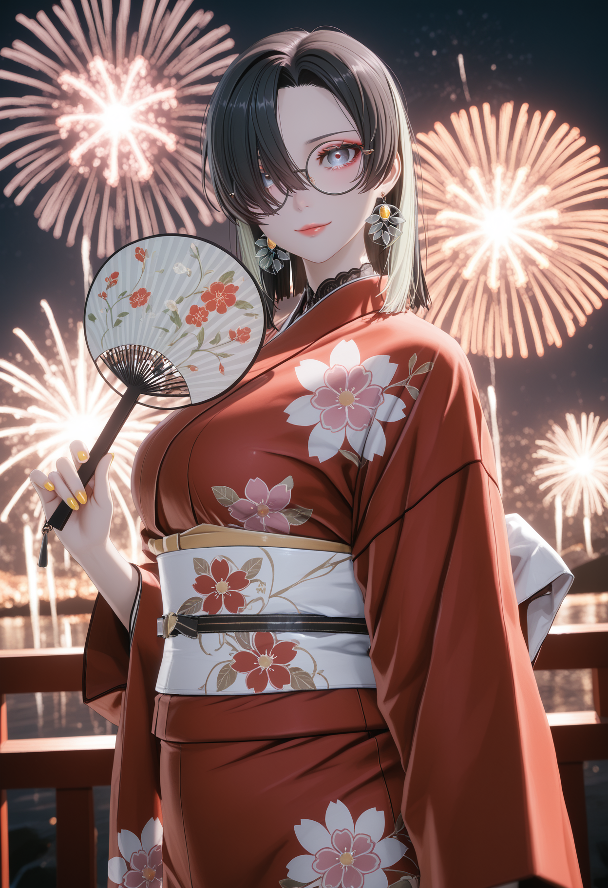 검은 머리, 컬러링된 안쪽 머리, 중간 길이 머리, 한쪽 눈을 가리는 머리, 비대칭 앞머리,