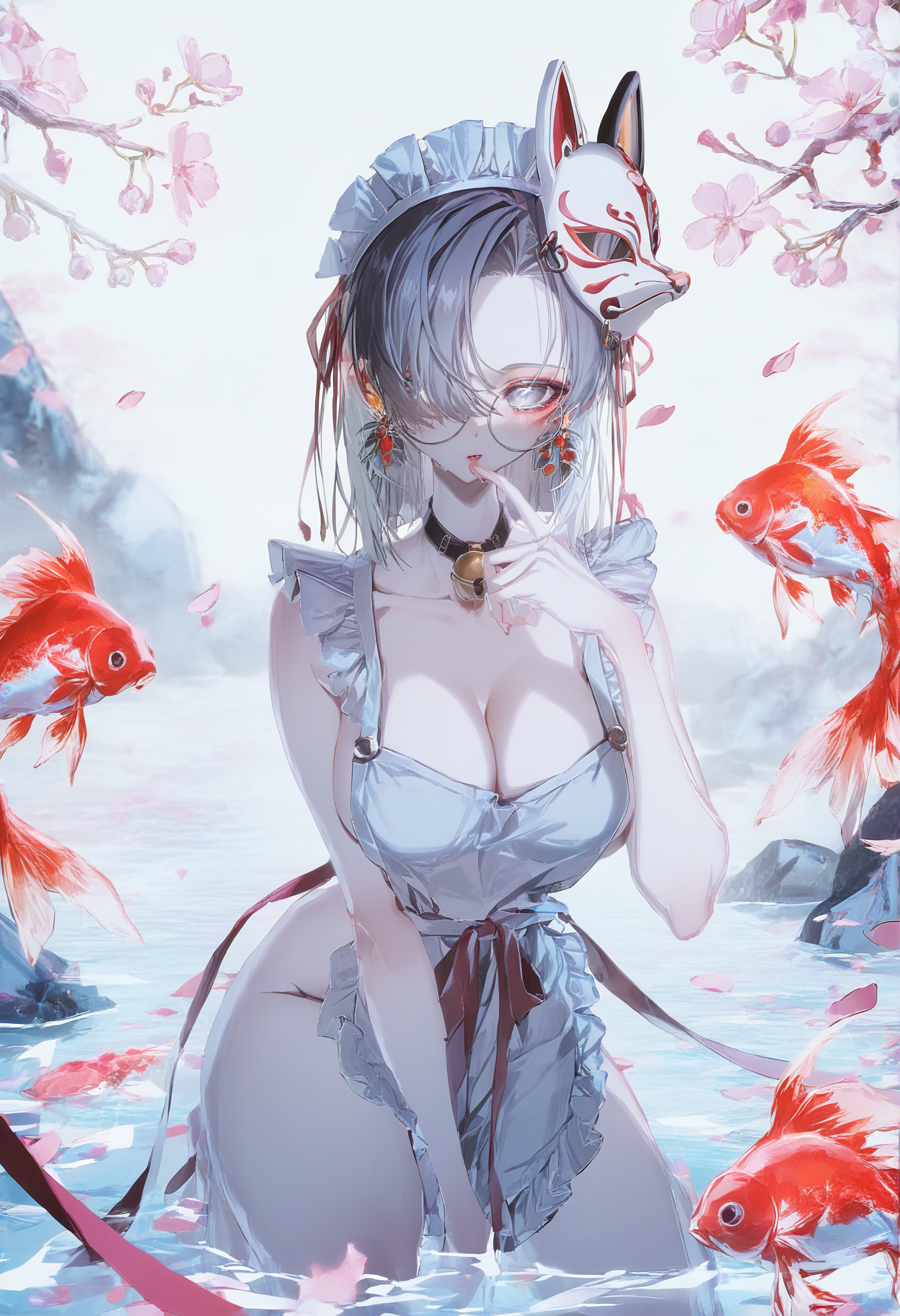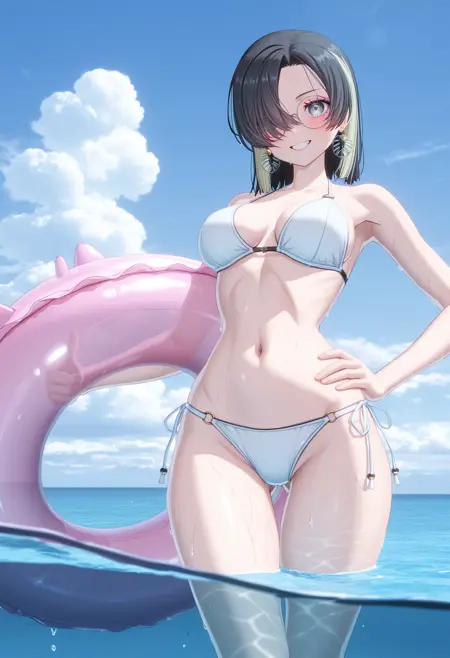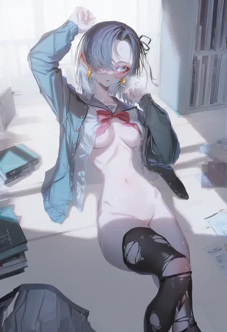 회색 머리, 컬러링된 안쪽 머리, 중간 길이 머리, 한쪽 눈을 가리는 머리, 비대칭 앞머리,