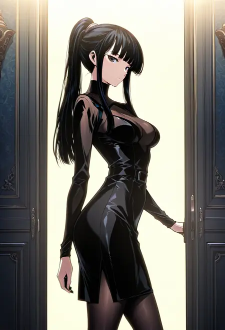 giselle, black hair, long hair, blunt bangs, long sidelocks, black eyes