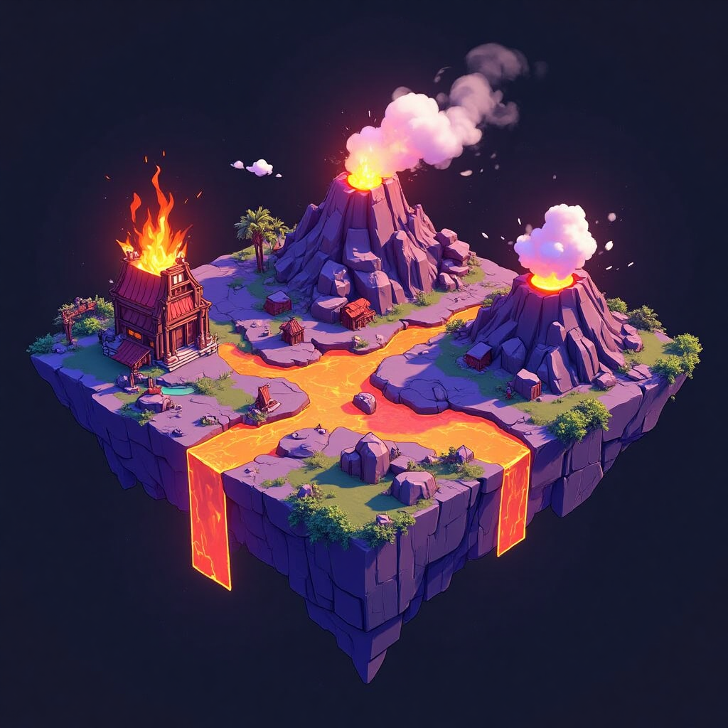 等距游戏场景设计,火山岛屿,熔岩河流,喷烟的山峰,岩石地形,炽热红色,强烈氛围。