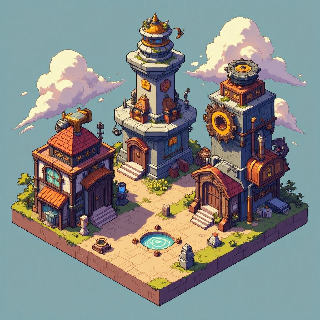 等距游戏场景设计,蒸汽朋克城市,齿轮遍布的塔楼,蒸汽管道,黄铜装饰,金属灰,工业能量。