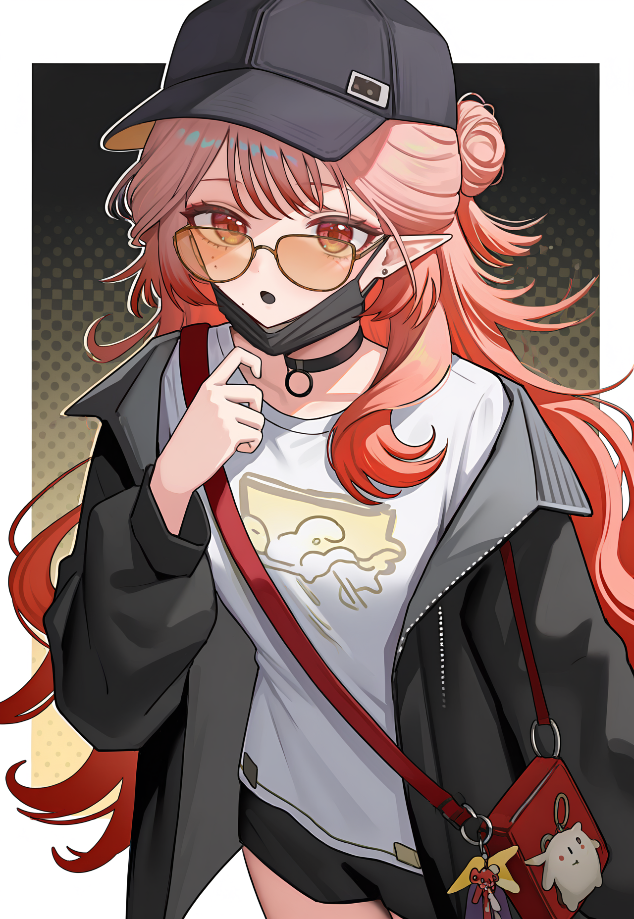 harukaoftcloth,검은 베이스볼 캡,주황색 안경,검은 마스크,마스크 끈,검은 목걸이,검은 재킷,열쇠고리,흰색 셔츠,프린트 셔츠,검은 반바지,빨간 어깨 가방,검은 리브 양말,검은 스니커즈