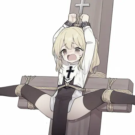 1girl,solo,bondage, rope bondage, crucifixion, arms up, arms tied, legs spread,