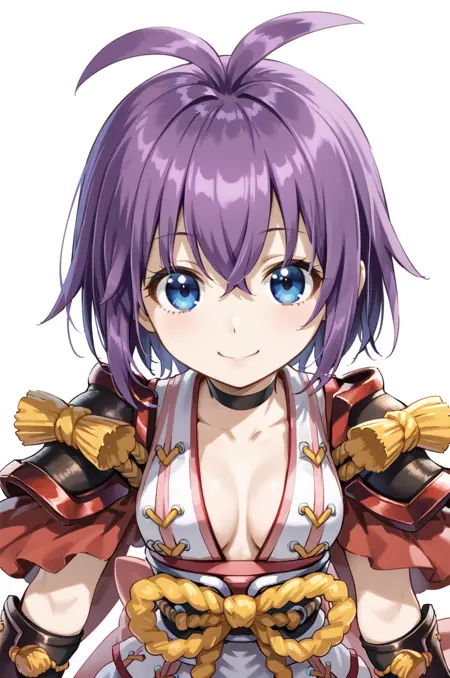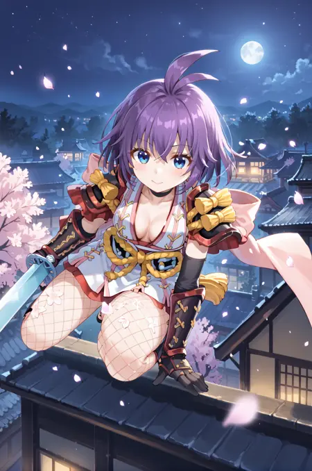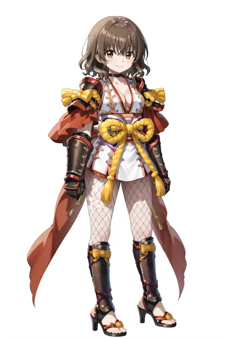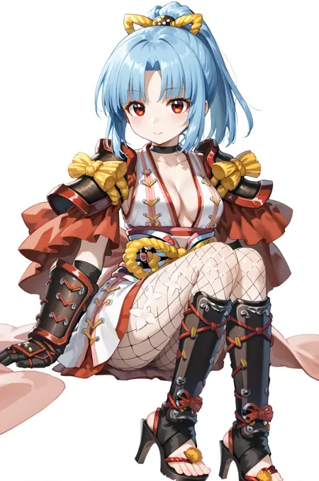 prompt: oboroRO, black elbow gloves, collarbone, white short kimono, skirt, tassel, shoulder armor, arm guards, sleeveless, cleavage cutout, ribbon, bow, robe, tassel, black choker, fishnet pantyhose, high heel boots, shin guards, toeless footwear,