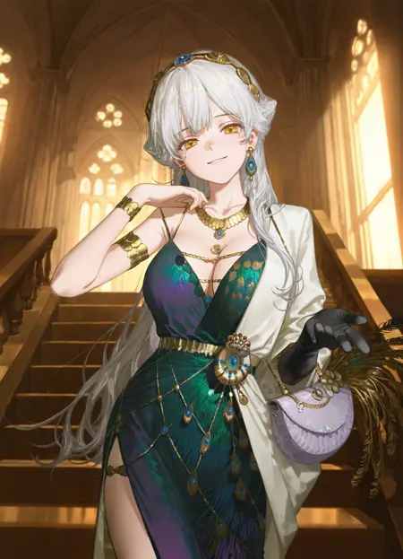 Eternity1999,white hair,long hair,yellow eyes,off shoulder,gradient dress,green dress,long dress,sleeveless dress,side slit,white coat,black gloves,elbow gloves,single elbow glove,jewelry,gold necklace,teardrop earrings,gold hairband,gem hair ornament,blue gemstone armlet,peacock feathers,purple shoulder bag,