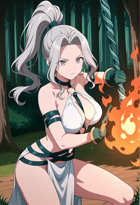 IV: 높은 폰테일, 측면 머리카락, 고리 귀걸이, O 링, 하네스, 장갑, 가죽 팔찌, 띠, 흰색 비키니