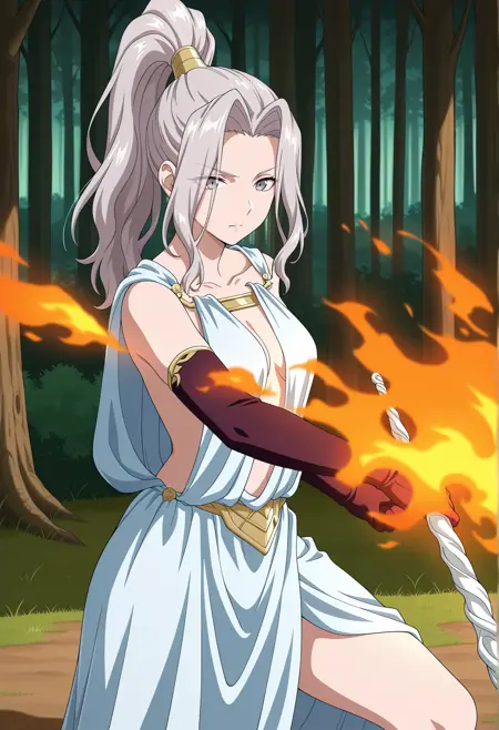 I-II: 높은 폰테일, 측면 머리카락, 고대 그리스 복장, 토가, 팔꿈치 장갑,