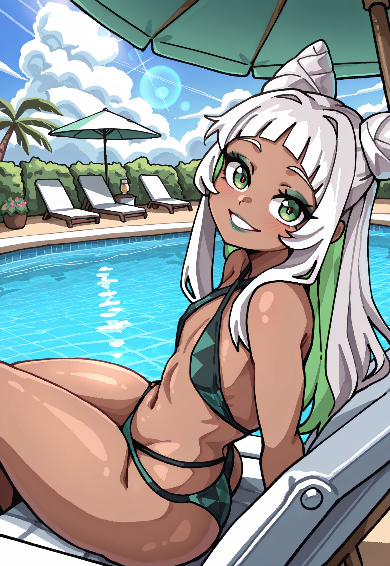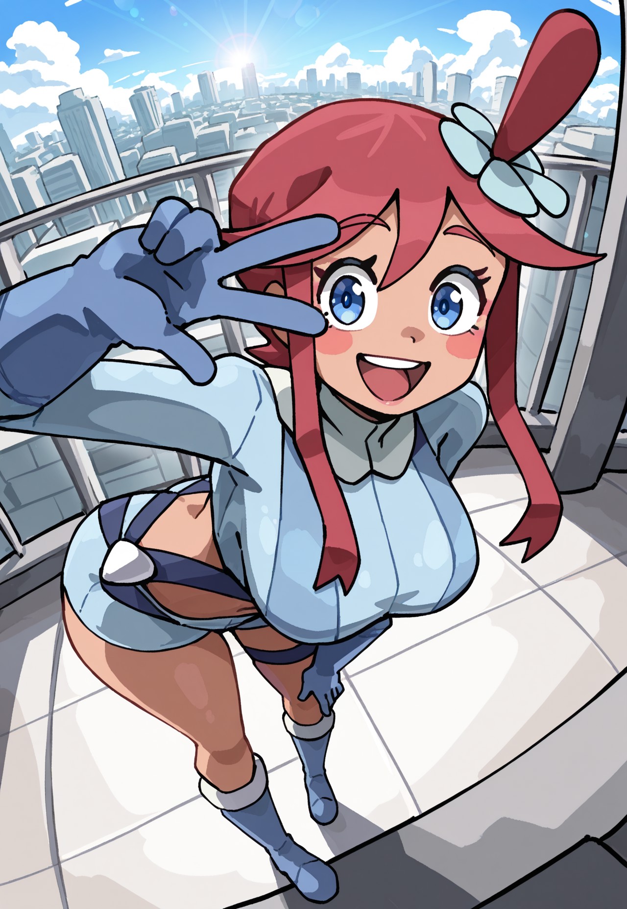 rgchan,1girl,large breasts,yellow hair,multicolored hair,orange tips,sidelocks,green eyes,medium hair,hair between eyes,goggles on head,
