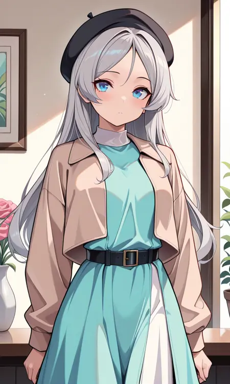 Sanma服装: javelinKC,蓝眼睛,灰发,长发,长袖,帽子,裙子,夹克,腰带,黑色头饰,蓝色裙子,贝雷帽,黑色腰带,棕色夹克,浅 Aqua 裙子,双色裙
