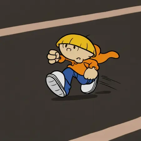 넘버4월, 금발, 볼 컷, 검은 눈, 빈 눈, 가린 눈, 주황색 후oodie, 청바지, 흰색 스니커즈, 캐리커처 아트 스타일,
