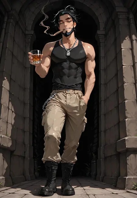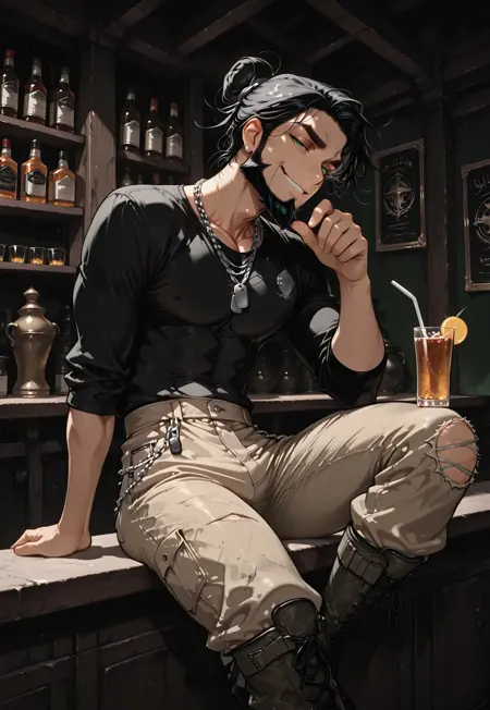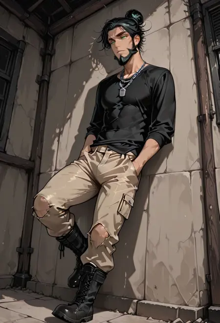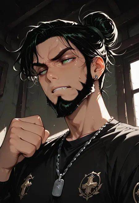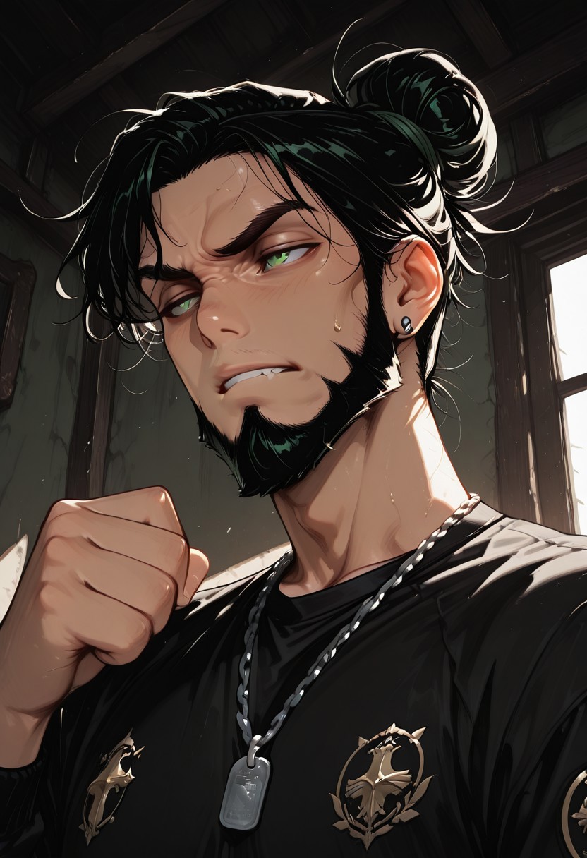 ((1male:1.9)), (defined masculine face:1.3), (green eyes:1.2), (light brown skin:1.1), (thick eyebrows:1.2), (medium-length messy black hair tied in top bun:1.3), (defined bigger beard:1.4), prominent jawline, single earring on left ear (metal feather), silver chain necklace with black dogtag,