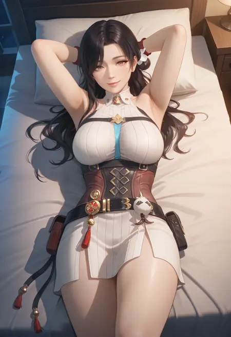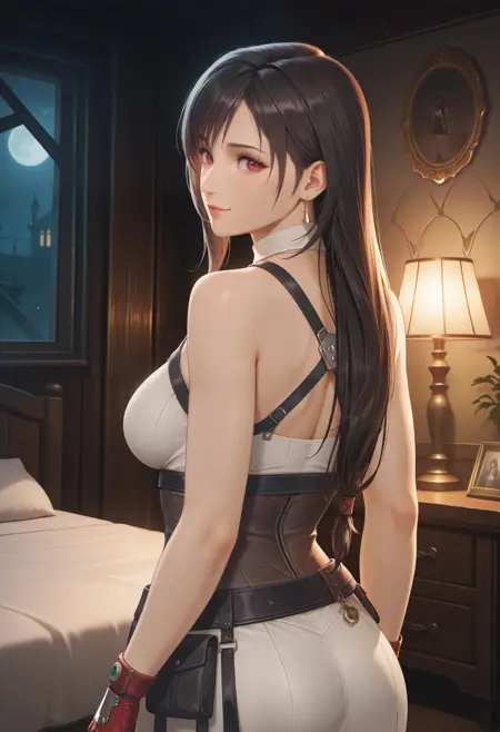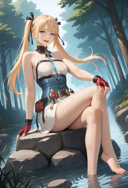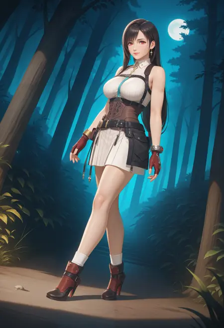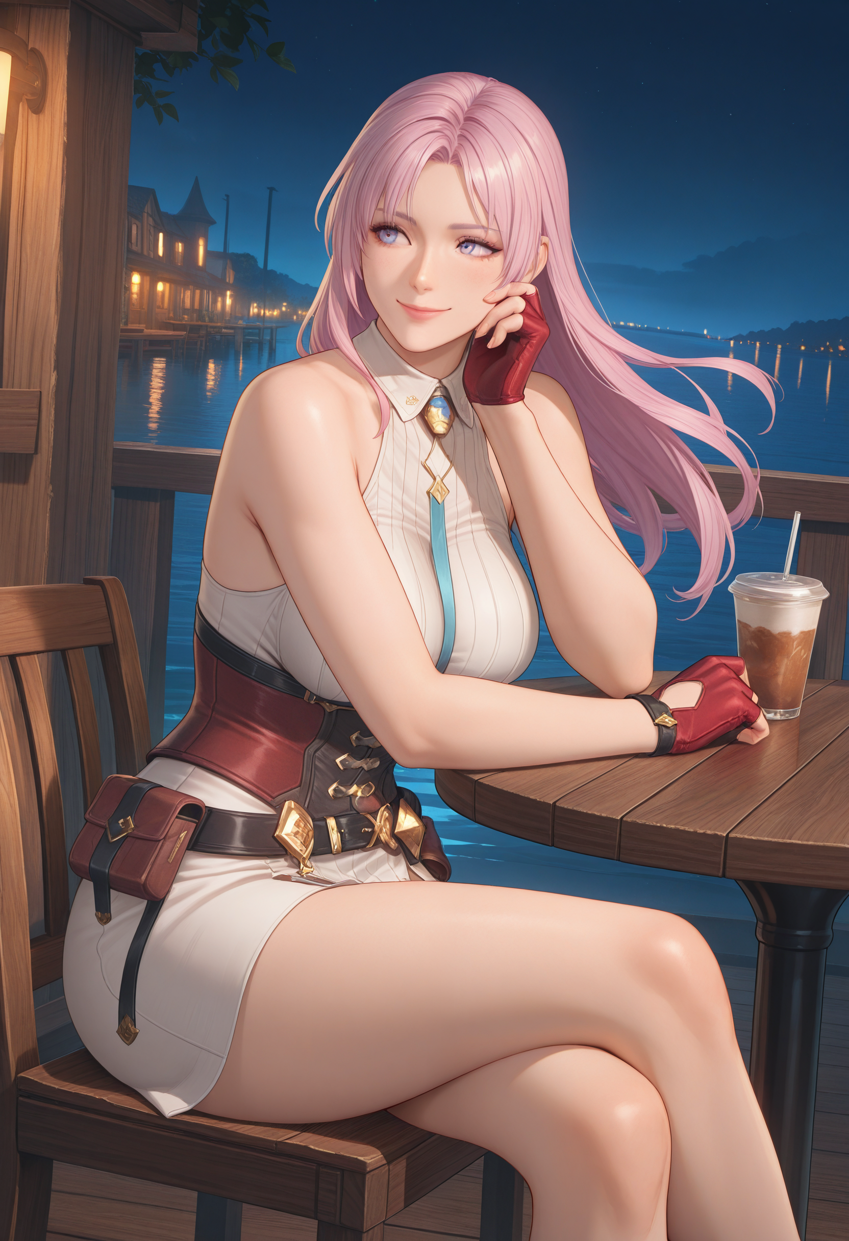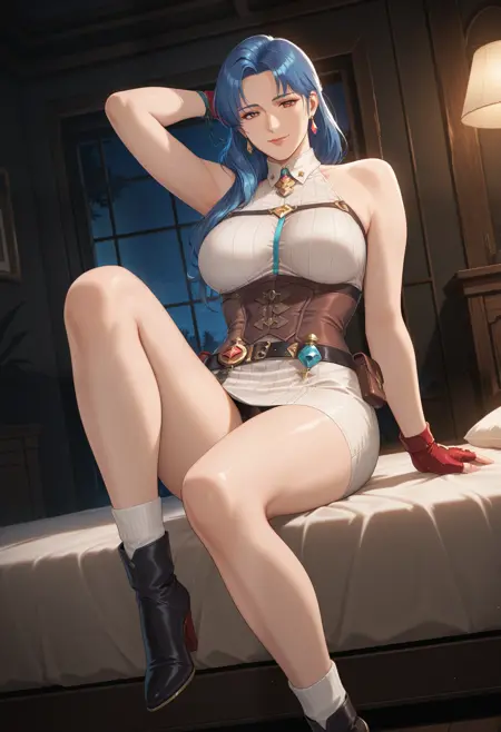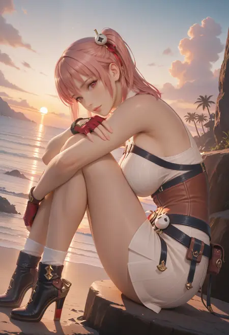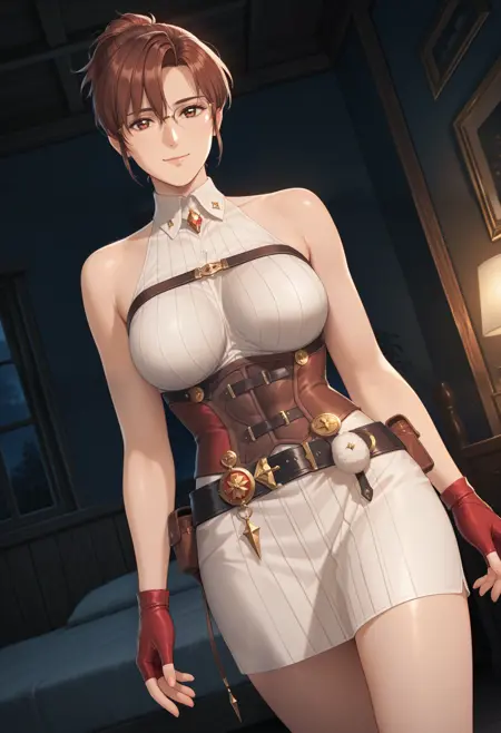 无夹克版: "AtelierYumiaUnderwear_Doaxvv,short dress,fantasy outfit,sleeveless,corset,fingerless red gloves,belt pouch,slit,detailed accessories,white socks,high heel boots"。