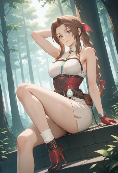 자켓 없음 버전: "AtelierYumiaUnderwear_Doaxvv,short dress,fantasy outfit,sleeveless,corset,fingerless red gloves,belt pouch,slit,detailed accessories,white socks,high heel boots".