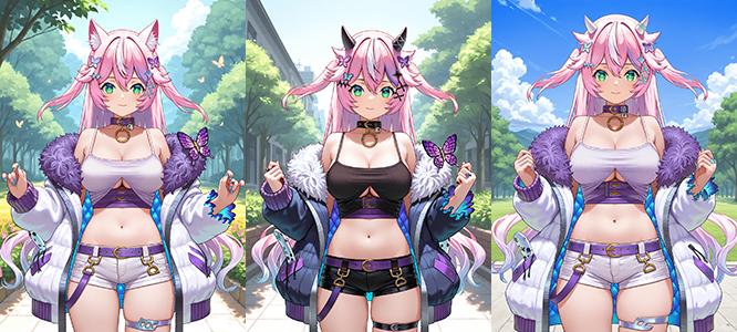 ring pendant choker, camisole, open jacket, butterfly fur trim, short shorts, thigh strap, white clothes,または
