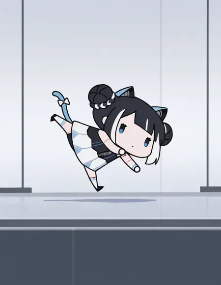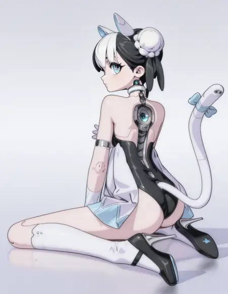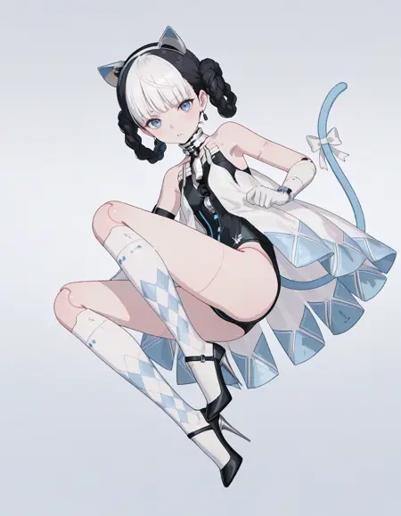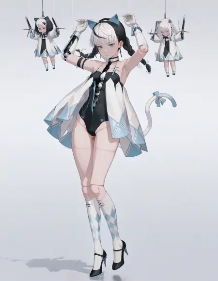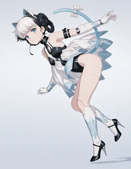 mai_pgr_bbnt_ll,multicolored_hair,white_hair,black_hair,twin_braids,braided bun,fake_cat_ears,fake_tail,blue_tail,tail bow,mechanical_parts,mechanical_arms,doll_joints,black_leotard,white_dress,white gloves,white socks,black high_heels,stiletto_heels