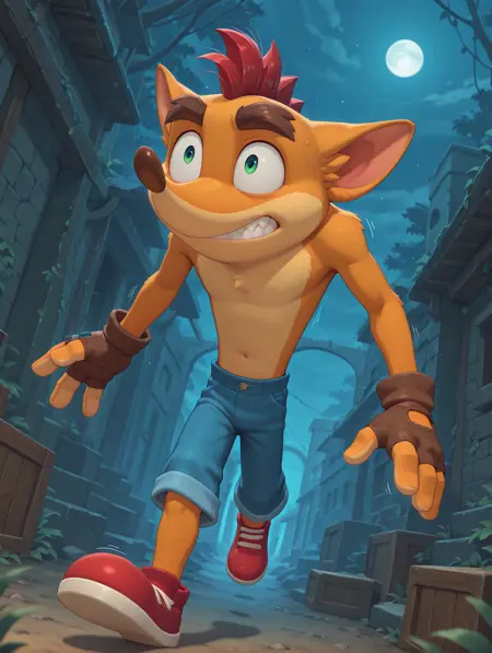 クラッシュ用タグ: ChickenCrash、furry male、two-tone fur、orange fur、animal ears、long nose、green eyes、red mohawk、huge eyebrows、fingerless gloves、denim shorts、red sneakers