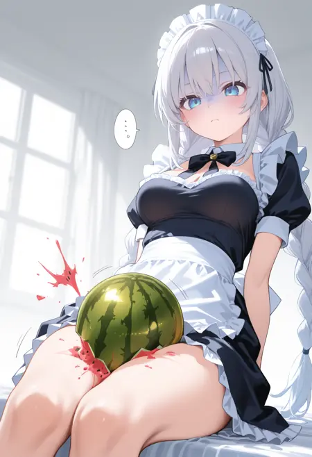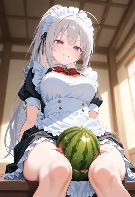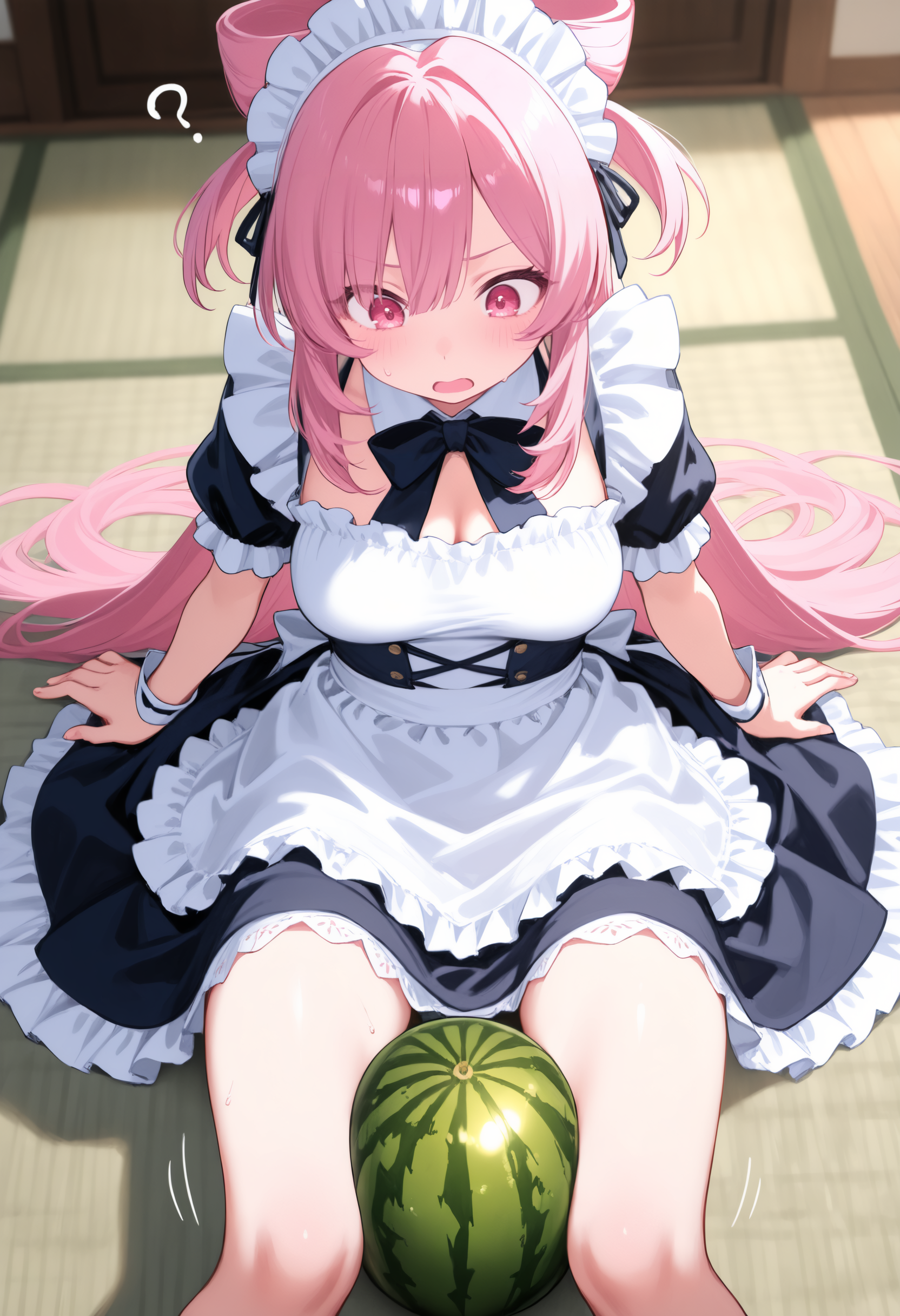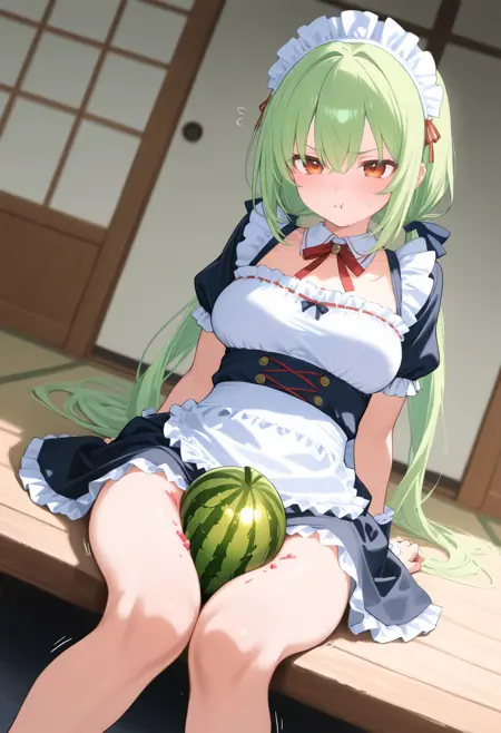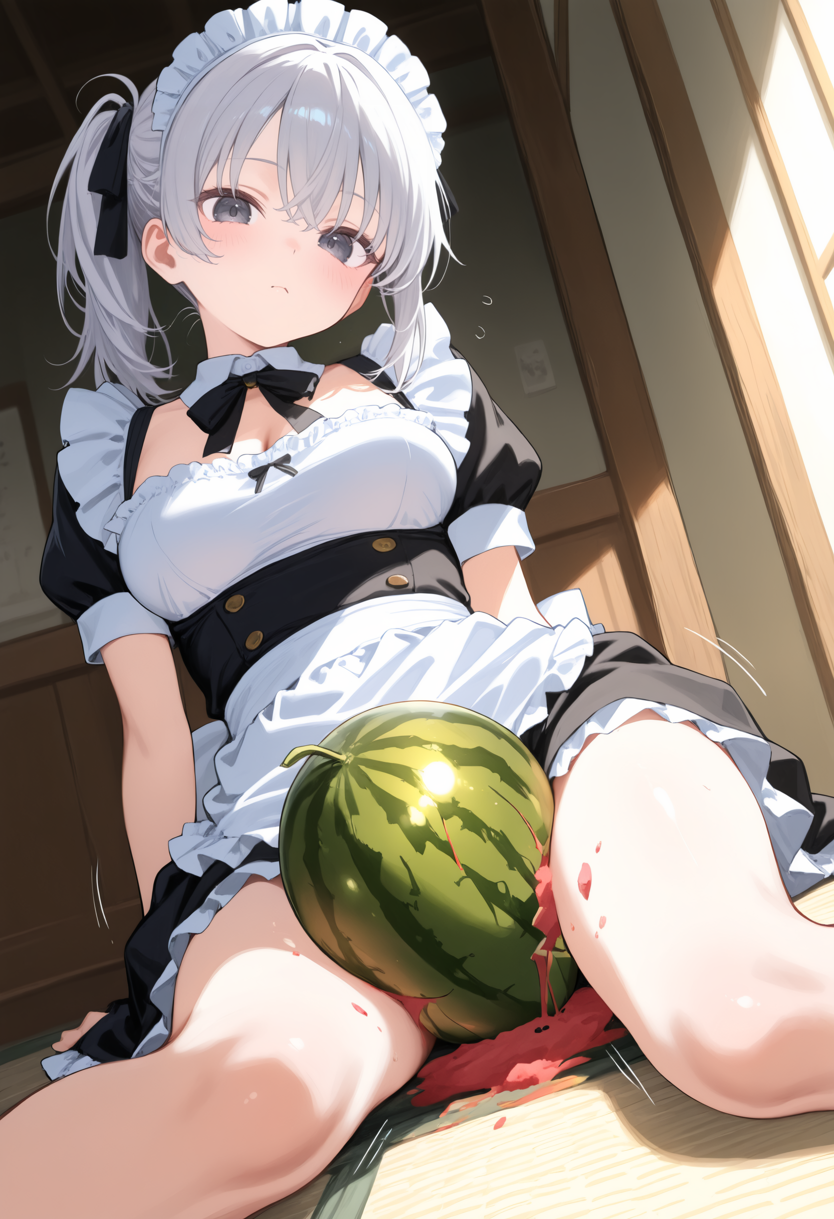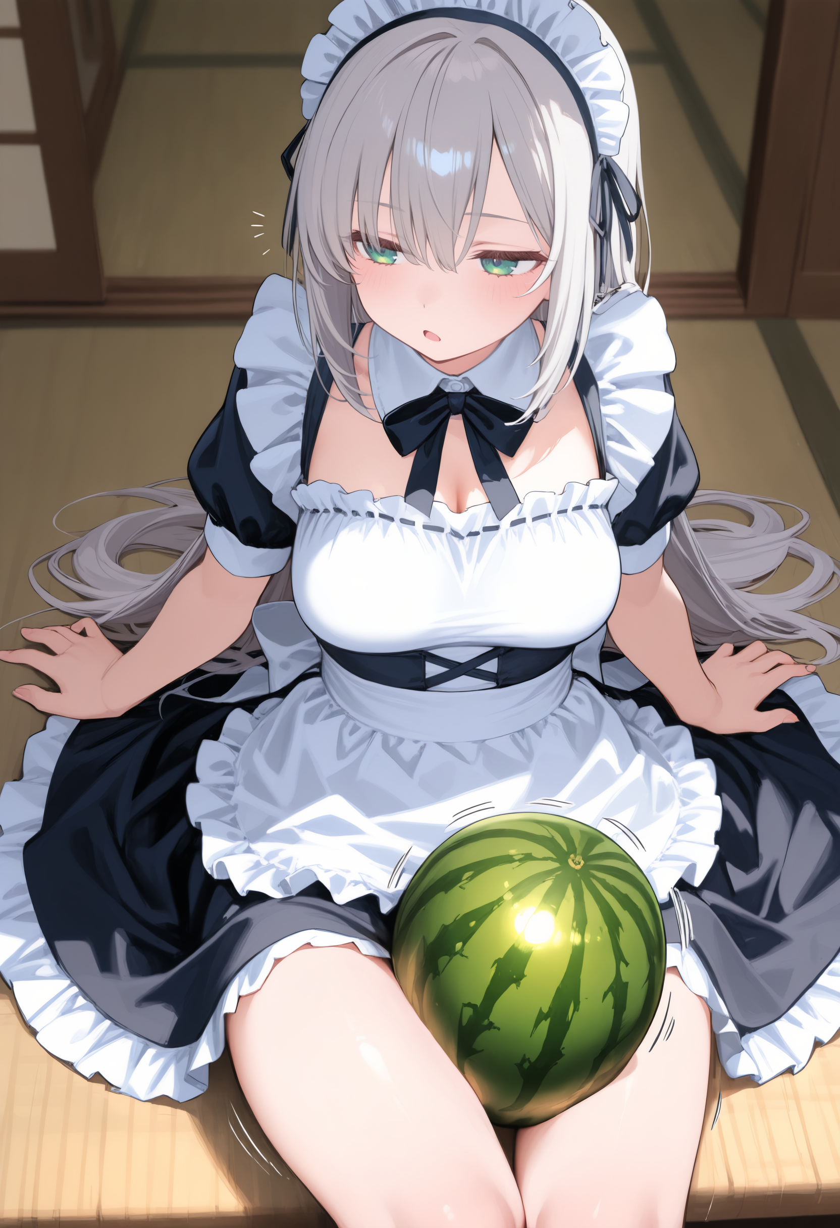 트리거만 사용할 경우 생성 확률이 불안정하므로, watermelon, fruit, arm support, sitting, thighs, legs, motion lines 등을 보강하면 더 잘 생성됩니다.