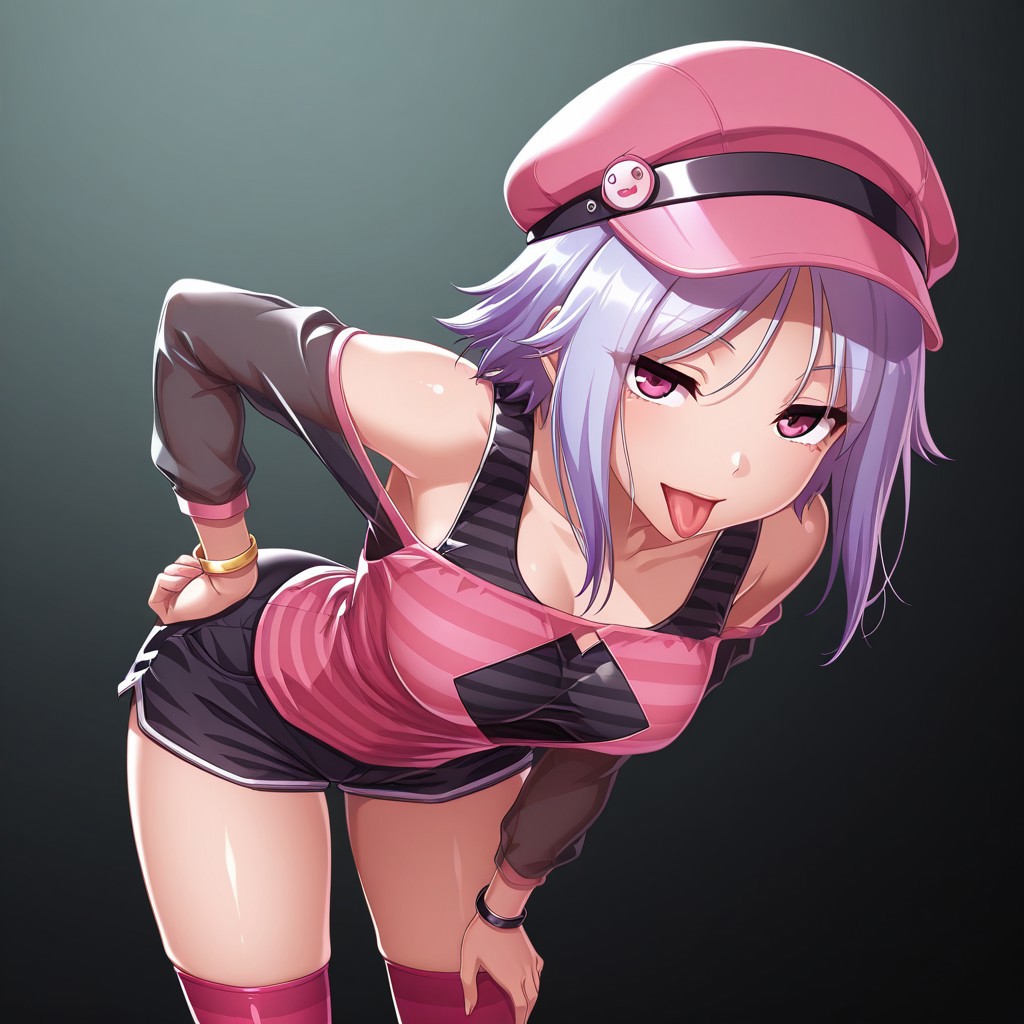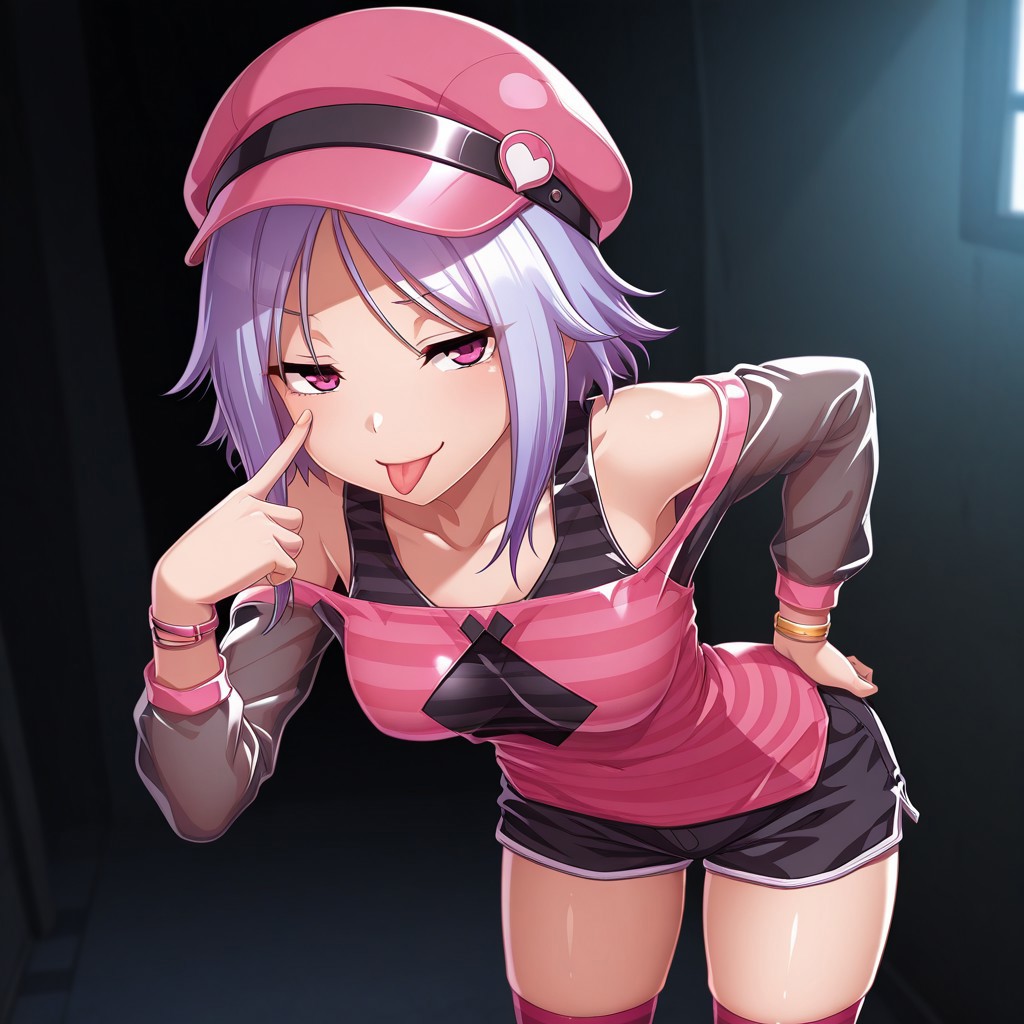 Casual: shoulders, pink cap, neglace, bracelets, black white striped crop top, pink striped top, pink striped off-shoulder top, transparent sleeves, black shoulder straps, transparent chest window, black shorts, pink black ringed tigh highs,