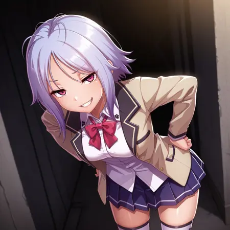 Uniform: white shirt, untucked shirt, red ribbon tie, beige blazer, open blazer, long sleeves, blue skirt, pleated skirt, white tigh highs, brown loafers,