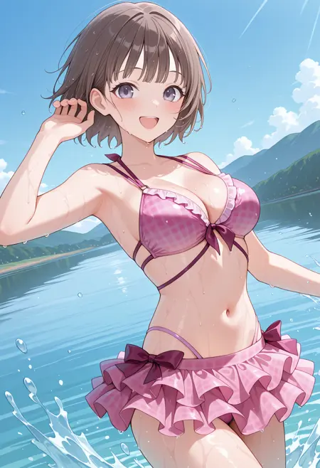 - 格子比基尼, 粉色比基尼, 多 strap 比基尼上衣, 比基尼裙, 层叠裙