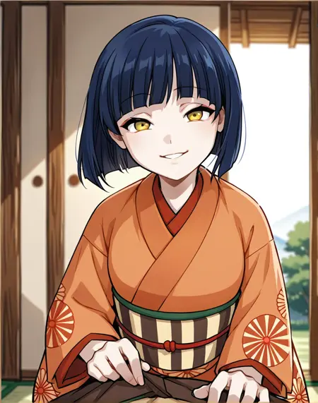 recommend: short hair, orange kimono, japanese clothes, bob cut, yellow eyes,