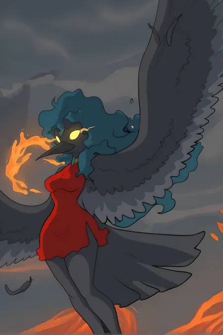 Murdersolo, 兽人, 女性, 乌鸦, M8r3r, 黑色身体, 黑色羽毛, 灰色翅膀, 蓝发, 全身肖像, 红色连衣裙, 短裙, 无袖, 翼状手臂, 羽毛手臂, 大手, 风, 长腿, 黄眼, 长发, 凌乱发, 波浪发, 黑色喙, 长腿, 火焰, 尾羽, 站立, 盯着观众, 正面视角,