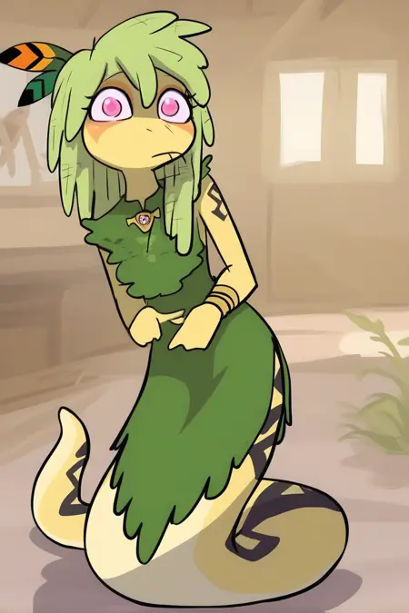 solo, 男性, 兽人, 响尾蛇, C0rn, 蛇女, 无足, 棕色身体, 发辫, 粉眼, 绿色服装, 绿发, 橙色眼线, 头发上插羽毛, 无袖, 手镯, 全身肖像, 盯着观众, 苗条, 尾铃(解剖结构),