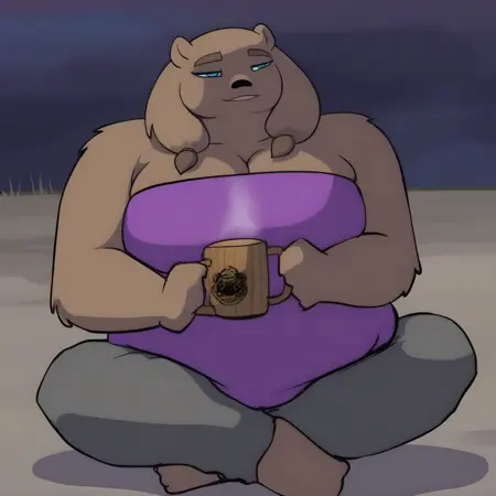 Paulasolo, 兽人, 熊, P4ul4, 棕发, 棕色身体, 棕色毛发, 编成双马尾, 中等长度头发, 发丝垂肩, 绿眼, 超重女性, 短袖, 正面视角, 蓝色工装裤, 粉色上衣, 花纹图案, 盯着观众,