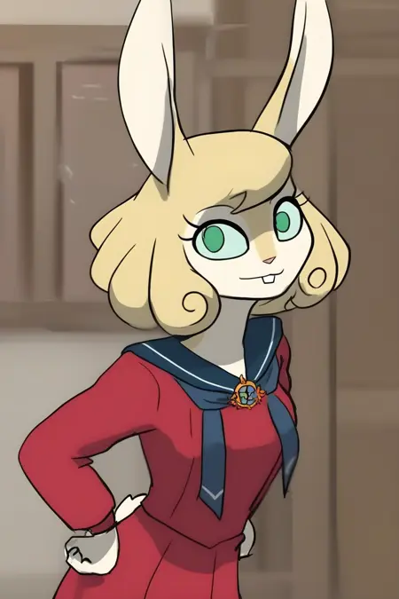 Wripsolo, 兽人, 兔子, 兔形目, Wr1p, 黄色毛发, 金发, 项链, 头发, 绿眼, 刘海, 中等长度头发, 粉色鼻子, 露齿, 盯着观众, 室内, 棉质尾巴, 双手叉腰, 校服, 短吻,