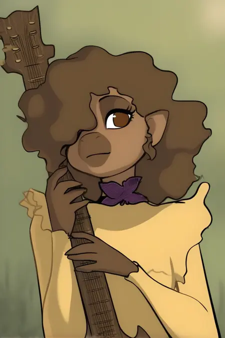 solo, 猴子, X0ch1, 女性, 睫毛, 尖耳, 棕色身体, 棕发, 兽人, 双色身体, 波浪发, 连衣裙, 黄色服装, 五指, 上半身, 棕眼, 棕色吻部, 苗条, 黑色项圈, 花朵项圈, 长袖, 长裙, 全身着装, 一侧眼睛被遮挡, 头发遮眼, 手持吉他, 正面视角, 中等长度头发, 盯着观众,