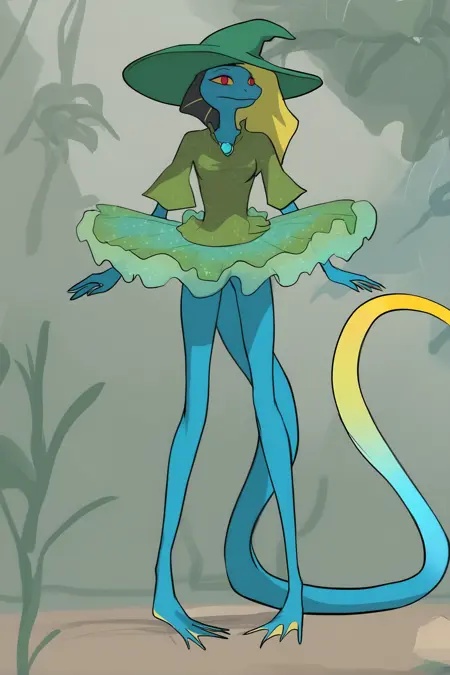 Calamity(约三分之一概率能成功生成)solo, 兽人, 女性, 爬行类, c4l4m1ty, 眼镜蛇蜥, 蓝色身体, 长尾, 鳍状头发, 刘海, 下半部剃光, 黄色尾尖, 绿色服装, 绿色巫师帽, 芭蕾舞裙, 上衣, 短袖, 长腿, 赤足, 全身肖像, 带蹼的脚, 苗条, 红眼, 黄色巩膜, 盯着观众, 正面视角,