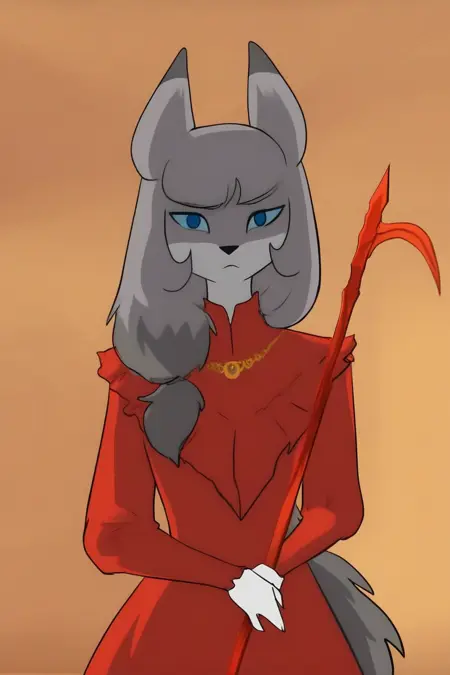 Kitty(当前版本)solo, fox, k1tty2, 灰发, 灰色身体, 长发, 直发, 发丝垂肩, 蓝眼, 双色身体, 红色连衣裙, 长裙, 优雅, 站立, 盯着观众, 正面视角, 白色手, 毛茸茸的尾巴, 手持武器, 红色镰刀, 上半身, 灰色高光,