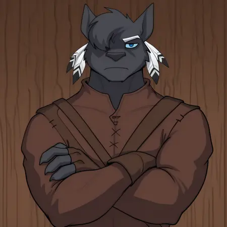 solo, anthro, male, swept bangs, short hair, black hair, black body, white fur. two tone body, blue eyes, white eyebrows, feather in hair, ear jewelry, 4 fingers, upper body, angry, one eye obstructed, hair over eye, brown clothing, leather armor, brown gloves, crossed arms, front view, looking at viewer, muscular male, long sleeves, fully clothed, thick neck, white snout, white neck, fingerless gloves,